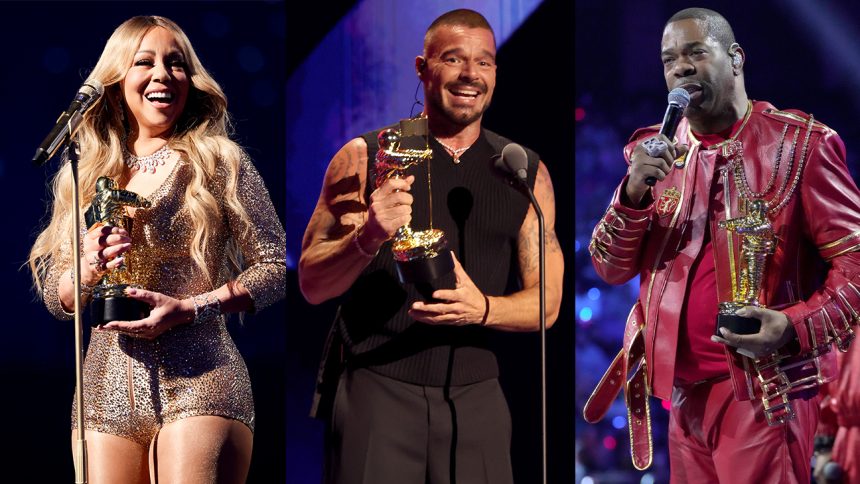 Mariah Carey finally received her first MTV Video Music Award on Sunday night when the Grammy-winning superstar singer was honored with the Video Vanguard Award. Though she’d been nominated for eight VMAs over the years, Carey had yet to win a competitive prize even as she was recognized with the prestigious Video Vanguard honor. Taking the stage after a performance of a medley of her hits, Carey joked of her long-awaited award, “What in the Sam Hill took you so long?!” Prior to receiving her honor, Carey performed snippets of her many hits, highlighting singles that also had particularly memorable videos, including “Honey,” “Heartbreaker,” “Obsessed,” “It’s Like That,” “We Belong Together” and the remix of her hit “Fantasy,” complete with audio of the late Ol’ Dirty Bastard’s rap intro. Read more. — Hilary Lewis